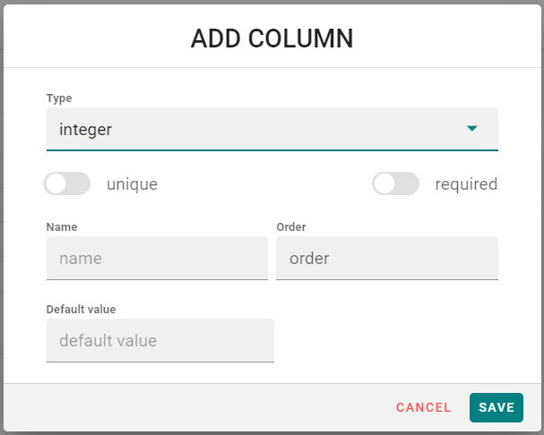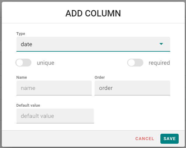 Voodat er records kunnen aangemaakt worden moeten er kolommen toegevoegd worden aan de tabel. Dit kan gedaan worden door op + te drukken achter "Columns". Er wordt gevraagd naar de type, de naam en order van de kolom.