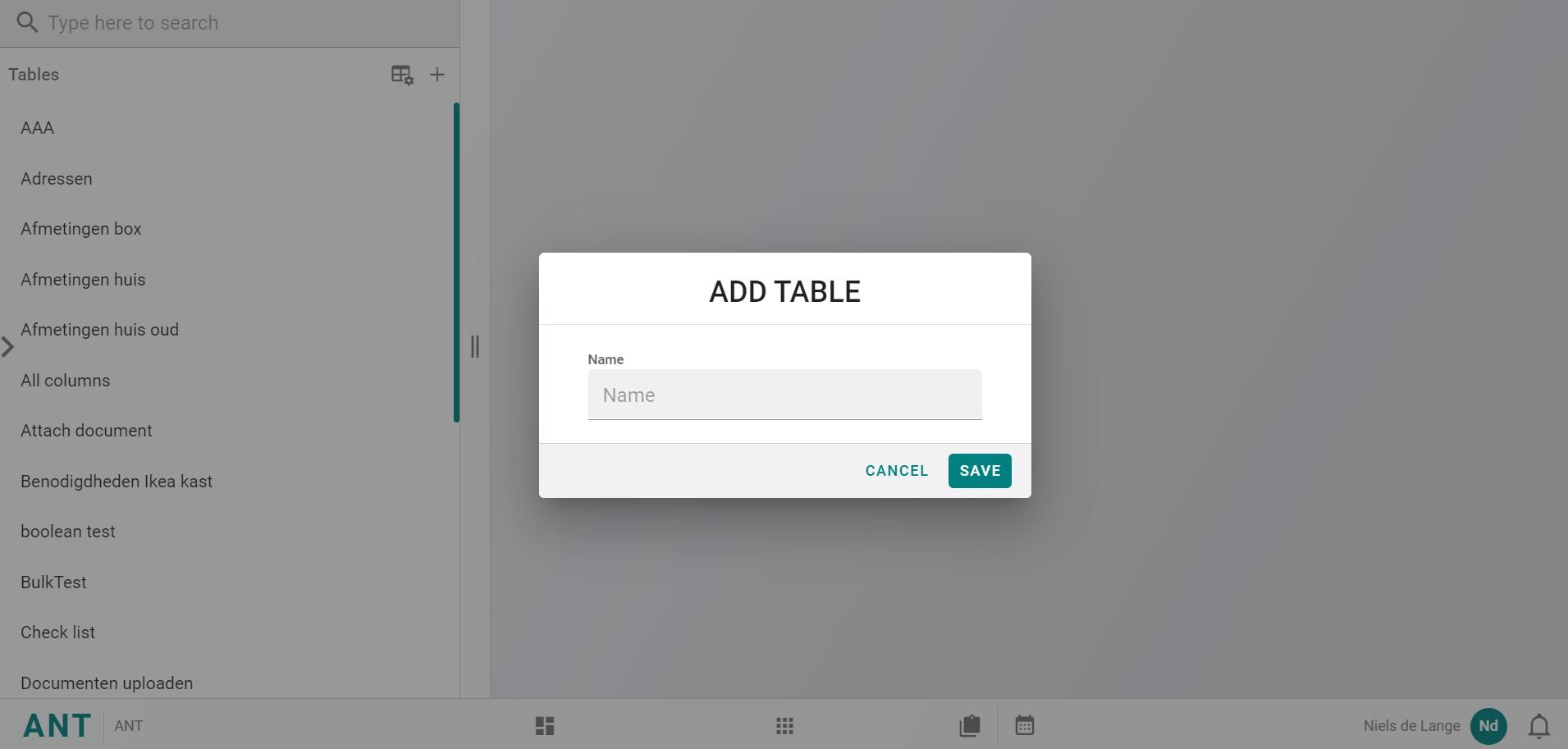 Om een tabel aan te maken kan er op + gedrukt worden, kies een naam van de tabel en durk op SAVE om de tabel aan te maken.