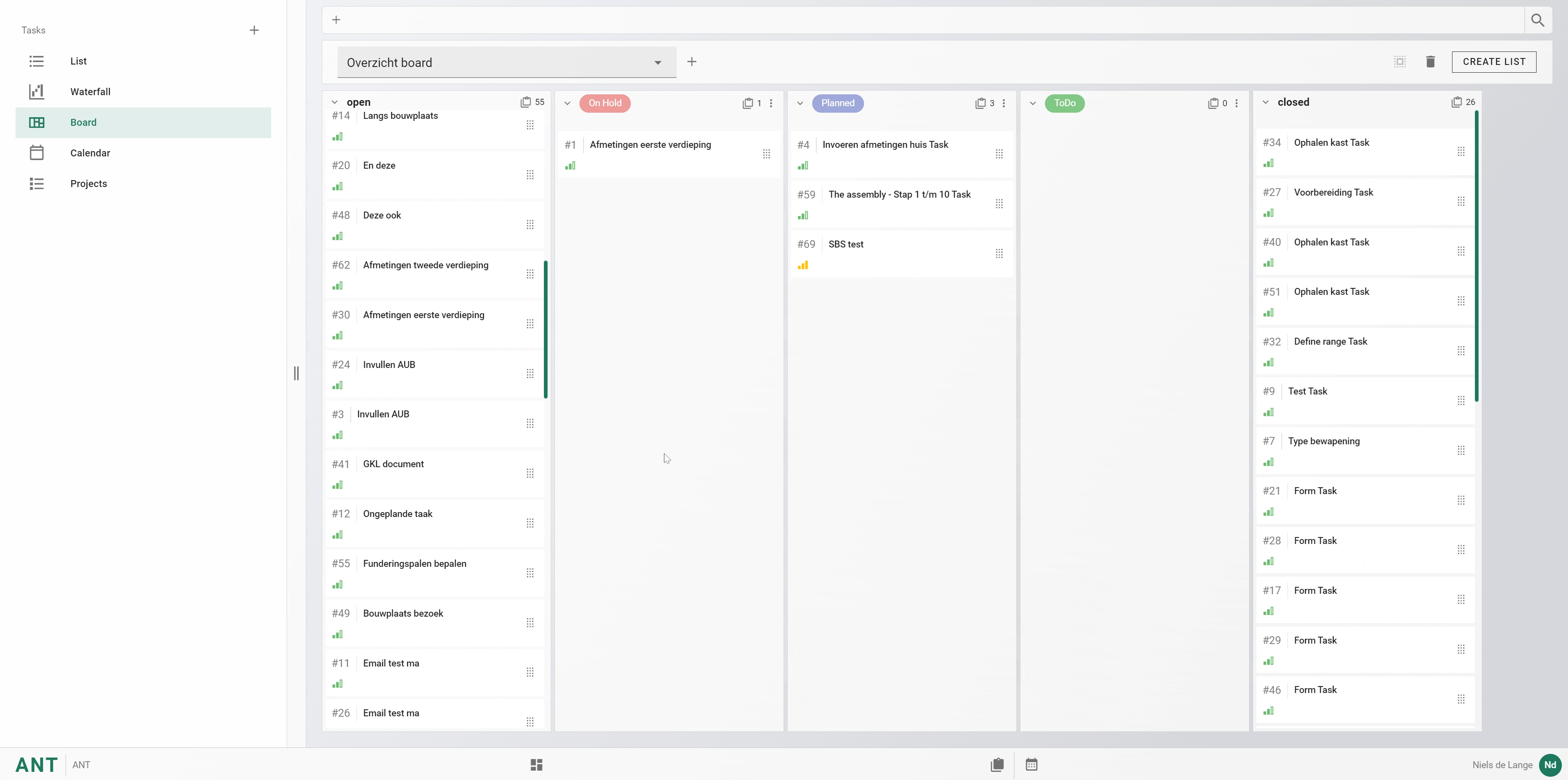In elk project van ANT kunnen taken ingepaland en toegekend worden aan mede-projectleden. In ANT zijn er verschillende manieren om taken in te zien, aan te maken en aan te passen.